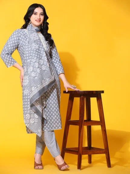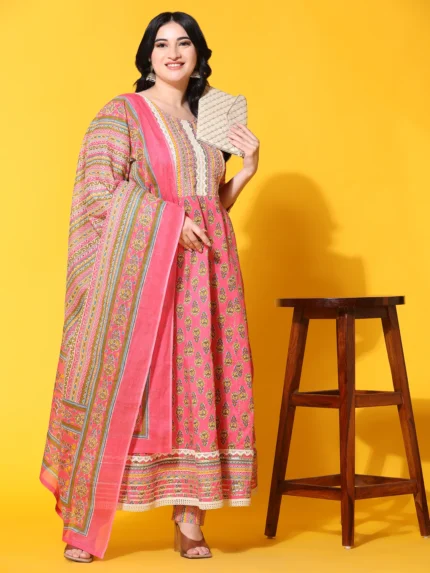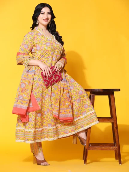 Ethnic Motifs Printed Angrakha Pure Cotton Kurta with Trousers & With Dupatta