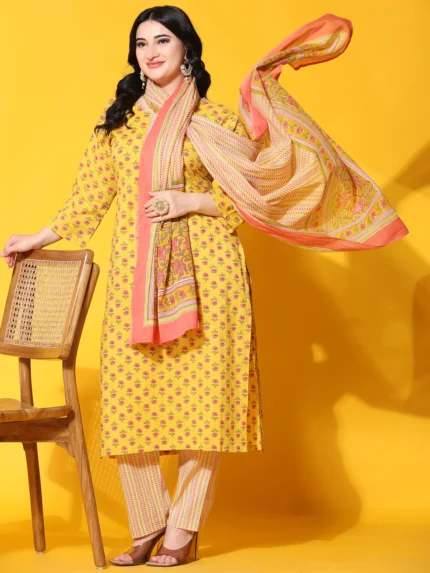 Ethnic Motifs Printed Pure Cotton Kurta with Trousers & With Dupatta
