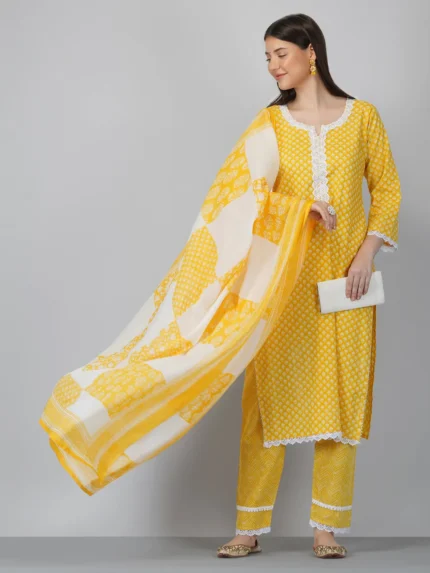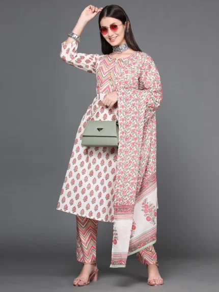 Printed Pure Cotton Kurta with Trousers & Dupatta Set