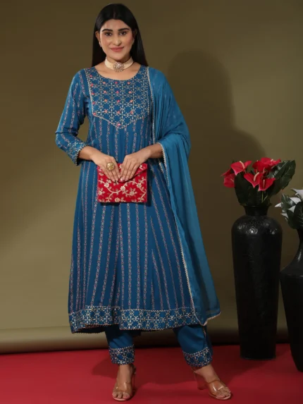 Ethnic Motifs Printed Empire Kurta with Trousers & With Dupatta